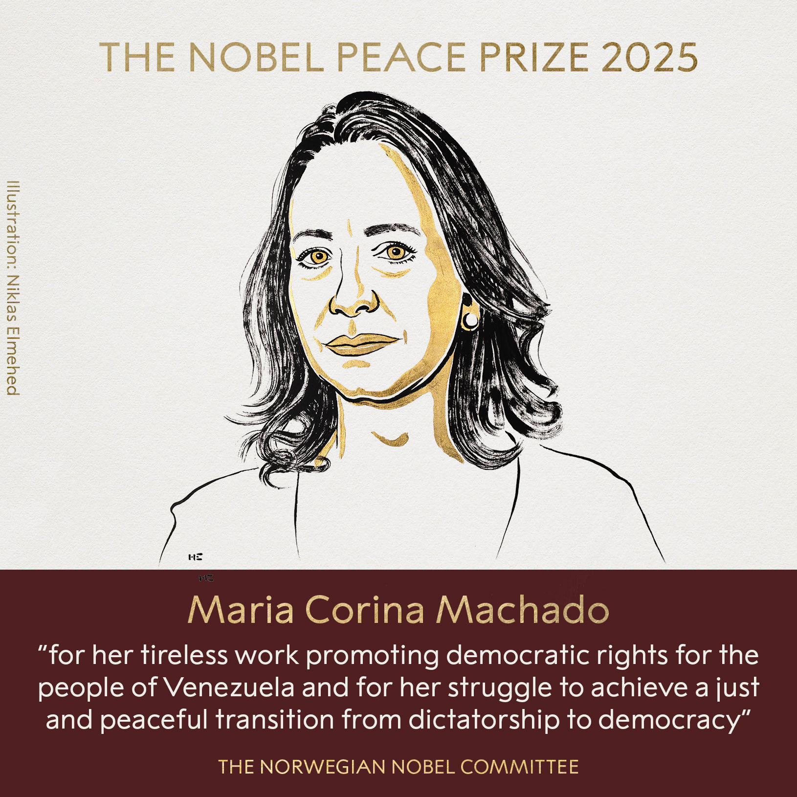 2025 ஆம் ஆண்டுக்கான அமைதிக்கான நோபல் பரிசை மரியா கொரினா மச்சாடோ (Maria Corina Machad) வென்றுள்ளார். இவர் வெனிசுலா அரசியல்வாதி ஆவார்.